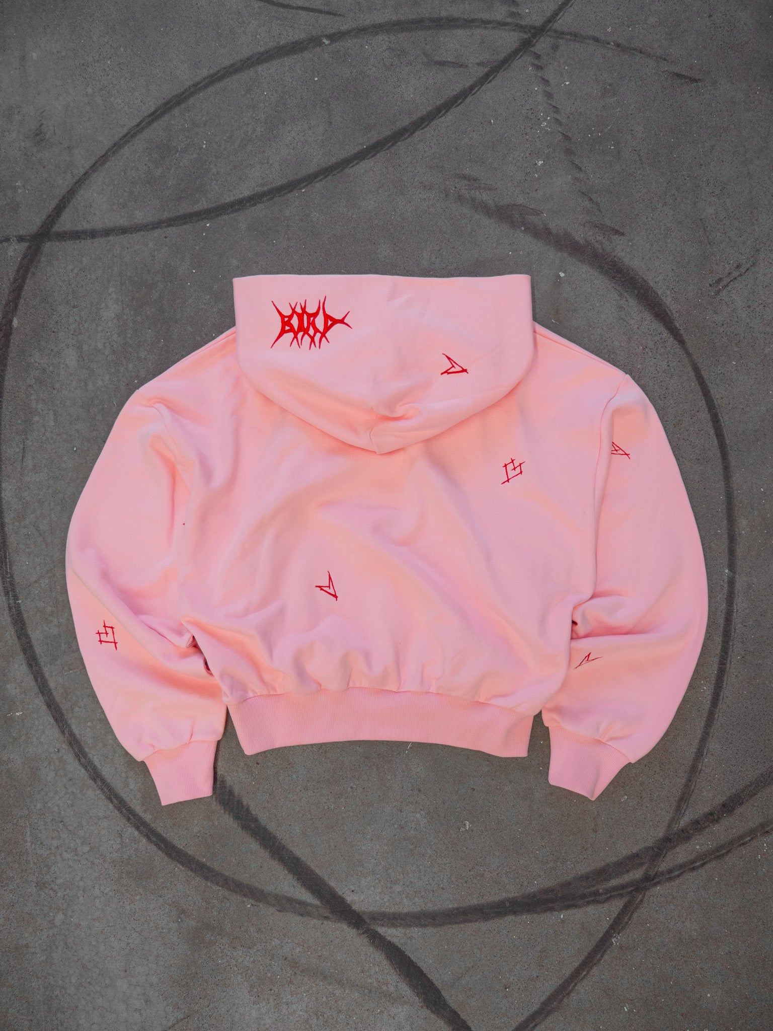 Red embroidered hearts that I drew myself all around the hoodies in sort of random assortments